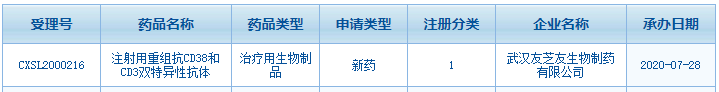 2020年7月28日,武漢(han)友芝友生(sheng)物(wu)(wu)制藥有限公(gong)司(以下簡稱“友芝友生(sheng)物(wu)(wu)”)自主研發(fa)的(de)(de)注射(she)用重組抗CD38和CD3人源(yuan)化雙特異性抗體(代號(hao):Y150)按“治療用生(sheng)物(wu)(wu)制品(pin)1類新藥”遞交的(de)(de)臨床試驗(yan)申請已獲得國家藥監局藥品(pin)審評中心正式受理,受理號(hao)為:CXSL2000216。該(gai)產品(pin)上市(shi)后將(jiang)用于治療多發(fa)性骨(gu)髓瘤。