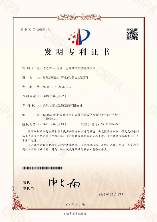 近日,武漢友芝友生物制藥有限公司(簡稱友芝友生物)核心平臺技術專利“改造的Fc片段,包含其的抗體及其應用”獲得國家知(zhi)識產權局的授權,專(zhuan)利授權號ZL201980003210.7。