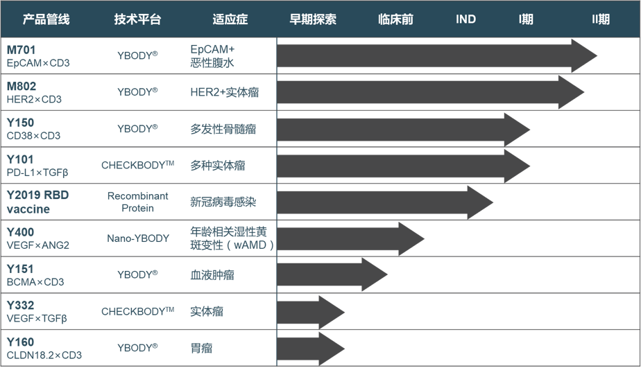 雙特(te)異(yi)性抗(kang)(kang)體(ti)(ti)藥(yao)(yao)物是下一(yi)代抗(kang)(kang)體(ti)(ti)藥(yao)(yao)物的(de)(de)核心(xin)發展(zhan)方向(xiang)之一(yi),在腫瘤、免疫、炎癥、代謝性、心(xin)血管(guan)和感染等(deng)(deng)重大(da)疾病領(ling)域具有廣泛的(de)(de)應用(yong)前景。友(you)芝友(you)生物基(ji)于自主創(chuang)新的(de)(de)抗(kang)(kang)體(ti)(ti)工程技(ji)術(shu)(shu), 成(cheng)(cheng)功(gong)建立了YBODY®及CHECKBODY™ 的(de)(de)雙特(te)異(yi)性抗(kang)(kang)體(ti)(ti)技(ji)術(shu)(shu)平(ping)臺,并已(yi)申報51項中(zhong)外(wai)專(zhuan)利(li),授權(quan)專(zhuan)利(li)26項, 其中(zhong)美國(guo)授權(quan)發明專(zhuan)利(li)7項。現有產品管(guan)線涵蓋腫瘤、眼科、感染等(deng)(deng)重大(da)疾病領(ling)域。基(ji)于獨特(te)的(de)(de)雙抗(kang)(kang)平(ping)臺及工藝技(ji)術(shu)(shu), 公司開(kai)發出(chu)的(de)(de)四個雙抗(kang)(kang)項目(mu)已(yi)成(cheng)(cheng)功(gong)進(jin)入臨(lin)床研究(jiu)階段, 初(chu)步臨(lin)床數據表明該系(xi)列產品具有良好(hao)的(de)(de)安全性和有效性。此外(wai),公司已(yi)完成(cheng)(cheng)多個項目(mu)的(de)(de)早期成(cheng)(cheng)藥(yao)(yao)性評價并正在進(jin)行CMC的(de)(de)開(kai)發(表1)。