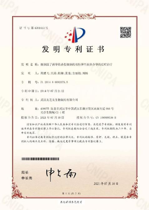 近日,武漢友(you)芝友(you)生物制(zhi)藥有限公司(簡稱(cheng)友(you)芝友(you)生物)雙(shuang)抗(kang)體(ti)相關發明專利 “細胞因子誘導的殺傷細胞的雙(shuang)特異(yi)性抗(kang)體(ti)介導的癌癥治療(liao)”獲得國家知識產權局的授權,專利授權號ZL201480082079.5。
