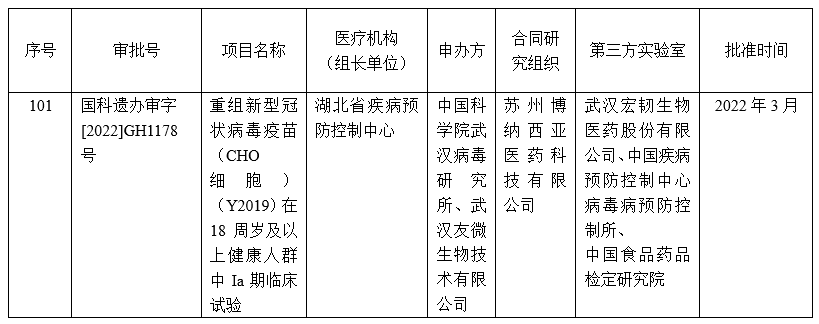 2022年3月23日,中國人類遺傳資源行政許可事項2022年第5批審批結果中,公示了我司全資子公司武漢友微生物技術有限公司和中國科學院武漢病毒研究所聯合開發的一款全新“重組新型冠狀病毒疫苗(CHO細胞)(Y2019)” 在湖北省疾病預防控制中心開展臨床試驗的合作科學研究事項。公示后,Y2019的中國臨床即可正式開展。