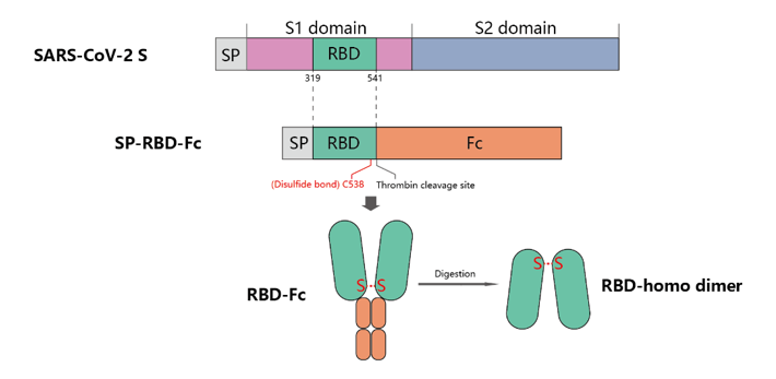 重組(zu)新型冠(guan)狀(zhuang)病(bing)毒疫苗(Y2019)是采用新冠(guan)病(bing)毒刺突蛋(dan)白受(shou)體(ti)結(jie)合域(Receptor Binding Domain,RBD)同源二聚體(ti)制備而成的(de)疫苗(見(jian)下圖)。此前,Y2019疫苗的(de)相(xiang)關研究結(jie)果已(yi)于(yu)2021年9月(yue)發表于(yu)國際學(xue)術(shu)期刊:《Cell Discovery》¹,題為“RBD-homodimer, a COVID-19 subunit vaccine candidate, elicits immunogenicity and protection in rodents and nonhuman primates”,作(zuo)者單(dan)位為武漢(han)病(bing)毒所(suo)和友(you)芝友(you)生物制藥。