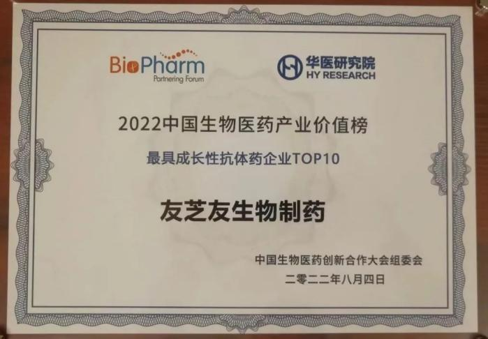 2022年8月4日,武漢友芝友生物制藥股份有限公司(以下稱“友芝友生物制藥”)獲2022第六屆中國生物醫藥創新合作大會暨2022中國生物醫藥產業價值榜頒獎盛典“最具成長性抗體藥企業TOP10”榮譽稱號。