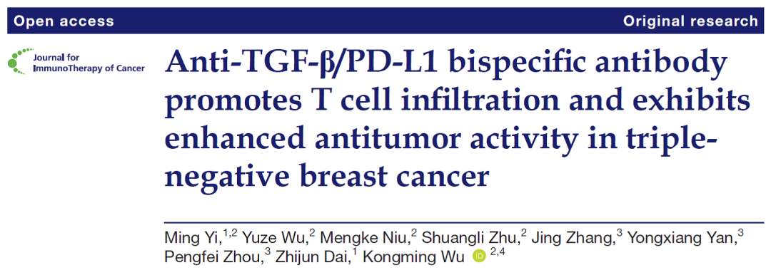 近日,《Anti-TGF-β/PD-L1 bispecific antibody promotes T cell infiltration and exhibits enhanced antitumor activity in triple-negative breast cancer》发表于《Journal for immunotherapy of cancer》(中科院一区,IF: 12.5)期刊,此研究由华中科技大学同济医学院附属同济医院肿瘤科吴孔明教授团队、浙江大学医学院附属第一医院乳腺外科代志军教授团队和武汉友芝友生物制药股份有限公司(以下简称友芝友生物)周鹏飞博士团队共同合作完成。