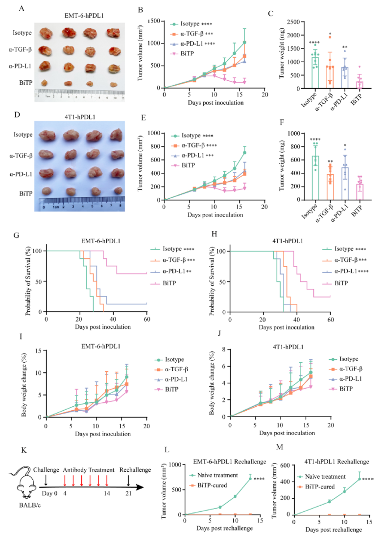 友芝友生物基于Check-BODY平台开发的四价对称的靶向TGF-β和人PD-L1的双特异性抗体(BiTP)对两个靶点均表现出高结合亲和力。体外实(shi)(shi)验证实(shi)(shi),BiTP有(you)效(xiao)阻(zu)断了(le)TGF-β-Smad和(he)(he)PD-L1-PD-1-NFAT信号传(chuan)导。友芝友生物(wu)构建了(le)两种(zhong)(zhong)将(jiang)鼠(shu)PD-L1替换(huan)为(wei)人PD-L1的(de)(de)小(xiao)鼠(shu)三阴(yin)性(xing)乳(ru)腺(xian)癌肿(zhong)瘤(liu)(liu)细胞(bao)株,EMT-6-hPDL1和(he)(he)4T1-hPDL1,并建立了(le)乳(ru)腺(xian)原位(wei)荷(he)瘤(liu)(liu)小(xiao)鼠(shu)模(mo)型。两种(zhong)(zhong)动(dong)物(wu)模(mo)型药(yao)效(xiao)实(shi)(shi)验表(biao)(biao)明(ming),BiTP相对(dui)于抗PD-L1和(he)(he)抗TGF-β单药(yao)治疗具(ju)有(you)优(you)越的(de)(de)抗肿(zhong)瘤(liu)(liu)活性(xing)。在机制(zhi)上,BiTP减少了(le)胶原蛋(dan)白(bai)沉积,增(zeng)强了(le)CD8+ T细胞(bao)的(de)(de)穿(chuan)透力,并增(zeng)加(jia)了(le)肿(zhong)瘤(liu)(liu)浸(jin)润淋巴细胞(bao)。本研究(jiu)发现,BiTP的(de)(de)这种(zhong)(zhong)改善了(le)肿(zhong)瘤(liu)(liu)微(wei)环(huan)境的(de)(de)作用(yong)提升(sheng)了(le)抗肿(zhong)瘤(liu)(liu)活性(xing),在TNBC中具(ju)有(you)优(you)于单抗的(de)(de)抗肿(zhong)瘤(liu)(liu)活性(xing),表(biao)(biao)明(ming)BiTP是(shi)一种(zhong)(zhong)对(dui)于TNBC治疗可能有(you)前途的(de)(de)药(yao)物(wu)。